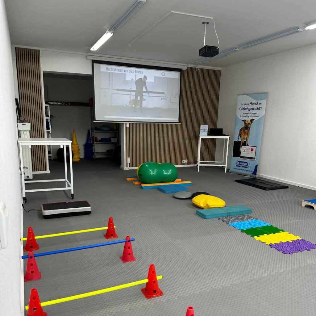 Auf unserer 70 qm großen Trainingsfläche findet der Muskelaufbau vieler Patienten statt mit unterschiedlichstem Equipment. Auch unsere Hundefitnesskurse und Massagekurse finden hier statt. Unsere Leinwand ist ausklappbar und unterstützt bei Kursen und Vorträgen.